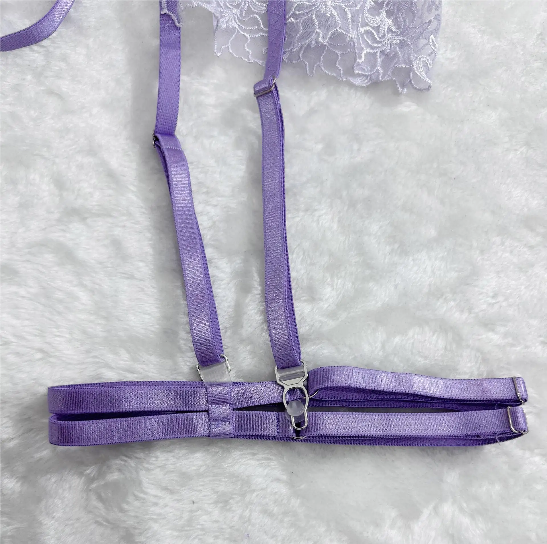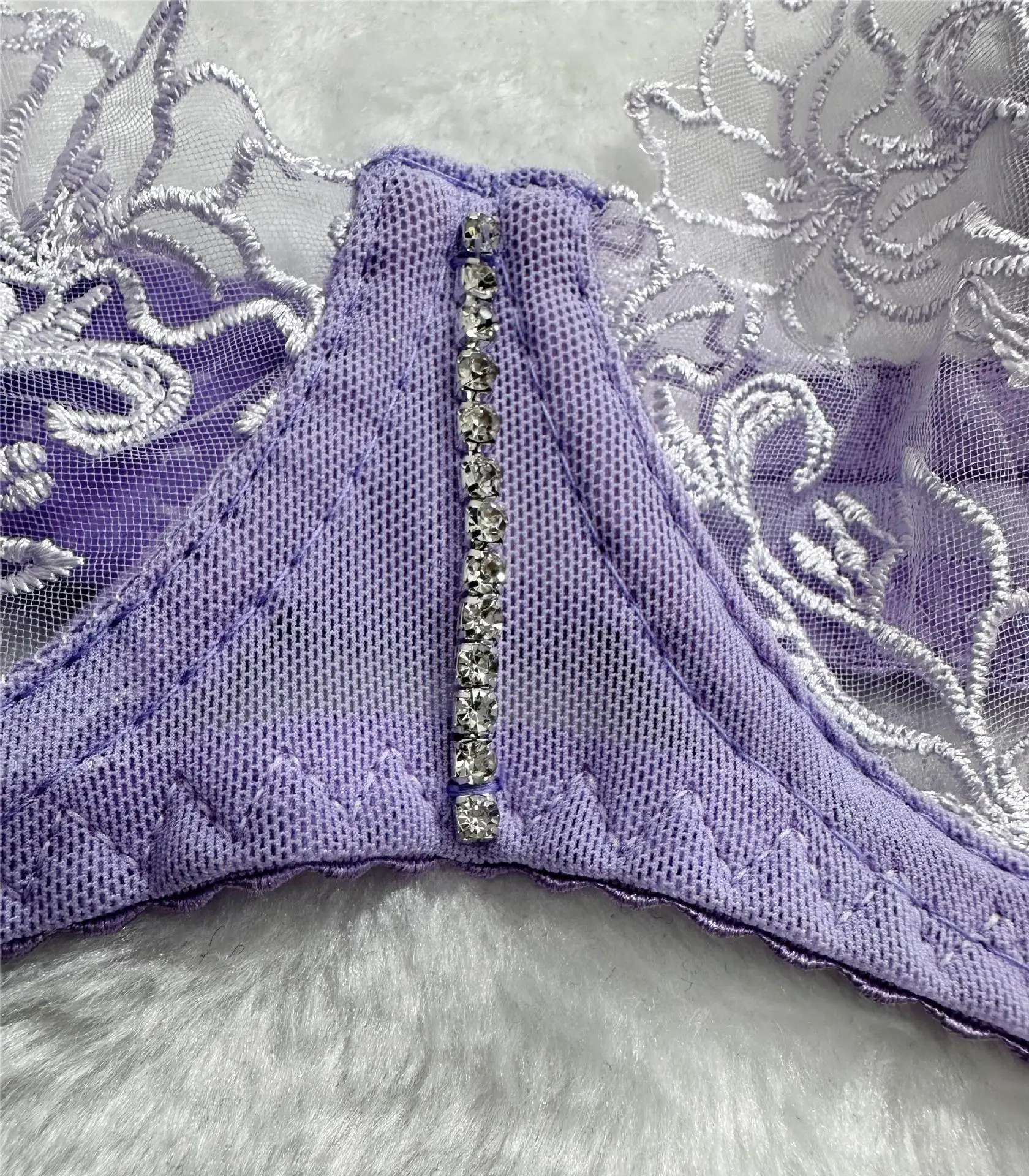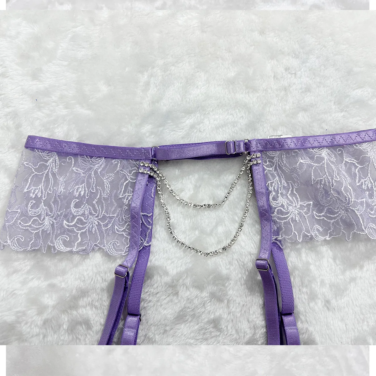 Female Lingerie Purple Sexy Lingerie With Rhinestone Chain Bra And Panty With Gloves Set